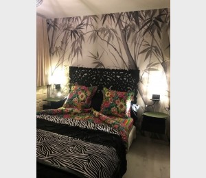 La chambre SAFARI , tout en noir et blanc, vous amène dans l’ambiance de Mombasa et de ses safaris!! un grand lit de 160 et un légère touche marocaine . La chambre bénéficie de la WIFI et d’internet. Bien sur, vous aurez également votre WC et Salle de bains privés.