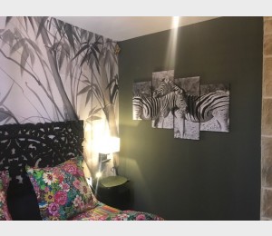 La chambre SAFARI , tout en noir et blanc, vous amène dans l’ambiance de Mombasa et de ses safaris!! un grand lit de 160 et un légère touche marocaine . La chambre bénéficie de la WIFI et d’internet. Bien sur, vous aurez également votre WC et Salle de bains privés.